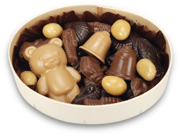 Boite bois fritures de Pâques ourson et cloches 220g