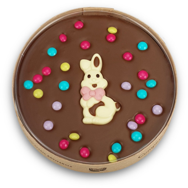 Ingrédients: Chocolat lait pur beurre de cacao: 36% minimum de cacao. Sucre, beurre de cacao, lait entier en poudre, pâte de cacao, noisette, lait maigre en poudre, lait écrémé en poudre, amidon de riz, enrobage sucre (sucre cristallisé origine betterave, sirop de glucose, miel), agent d'enrobage (gomme arabique, cire d'abeille, cire de carnauba, shellac), émulsifiant (lécithine de soja), concentrés (carotte, spiruline, radis, pomme, cassis, patate douce, extrait de betterave), arôme naturel de vanille, vanilline, sel, colorants alimentaires du décors: E133 (bleu brillant FCF). Peut contenir des traces de: gluten, oeufs, fruits à coques, sésame.